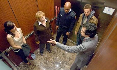 The second story follows a group of five strangers who make what turns out to be a fateful choice in boarding an elevator at the same time. The elevator is in the same building where the suicide or murder victim fell to his or her death earlier in the day, and we soon discover that this initial incident may only signal the beginning of a greater catastrophe, which will end in a lot more death and bloodshed.