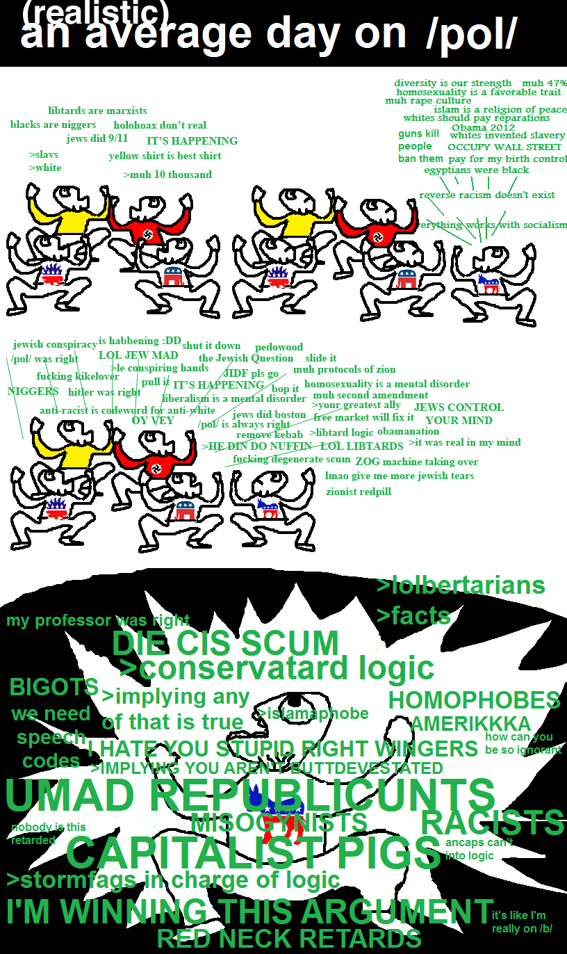 Here, you will meet a wide range of very interesting people, including Afrocentrists, Libertarians, NatSocs, Monarchists, Anarchists (primarily AnCaps), White Nationalists, Identitarians, Persons of Color, Persons of No Color, Globalists, Ant-Globalists, Transhumanists, Stormfags, Trolls, Feminist Trolls, Jewish Trolls, Asian Trolls, Muslim Trolls, Statist Trolls, White-People-Who-Pretend-To-Be-Jewish-And/Or-Person-of-Color Trolls and Shills (/pol/’s infested with them), all of whom debate complex political issues, discuss metapolitical concepts and ponder current events: