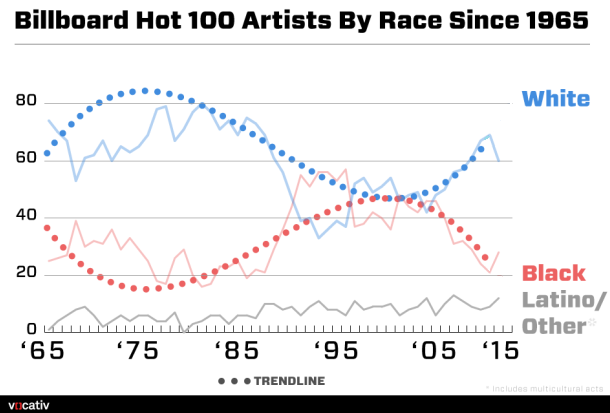 | Never more than 13% of the population, Afros are from 18% to 58% of the Billboard Hot 100 in any given year. |
