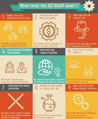 "The Alt Right is opposed to the rule or domination of any native ethnic group by another, particularly in the sovereign homelands of the dominated peoples..."But whatever grand manifesto of bullet points one cares to come up with from the "Grand Central Committee of me-and-my-opinions," we should be careful not to try to condense and crystallize the potent gas that is the Alt-Right. The problem with all these petty manifestos and reductionist equations is that they take something that is naturally turbulent, fuzzy, nebulous, and synergetic and try to make it obvious, pat, and static.