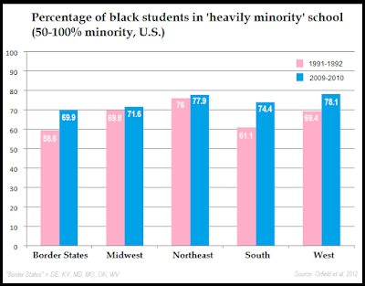 The nation’s most segregated schools aren’t in the deep south — they’re in New York, according to a report released Tuesday by UCLA's Civil Rights Project. That means that in 2009, black and Latino students in New York “had the highest concentration in intensely-segregated public schools,” in which white students made up less than 10 percent of enrollment and “the lowest exposure to white students,” wrote John Kucsera, a UCLA researcher.