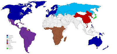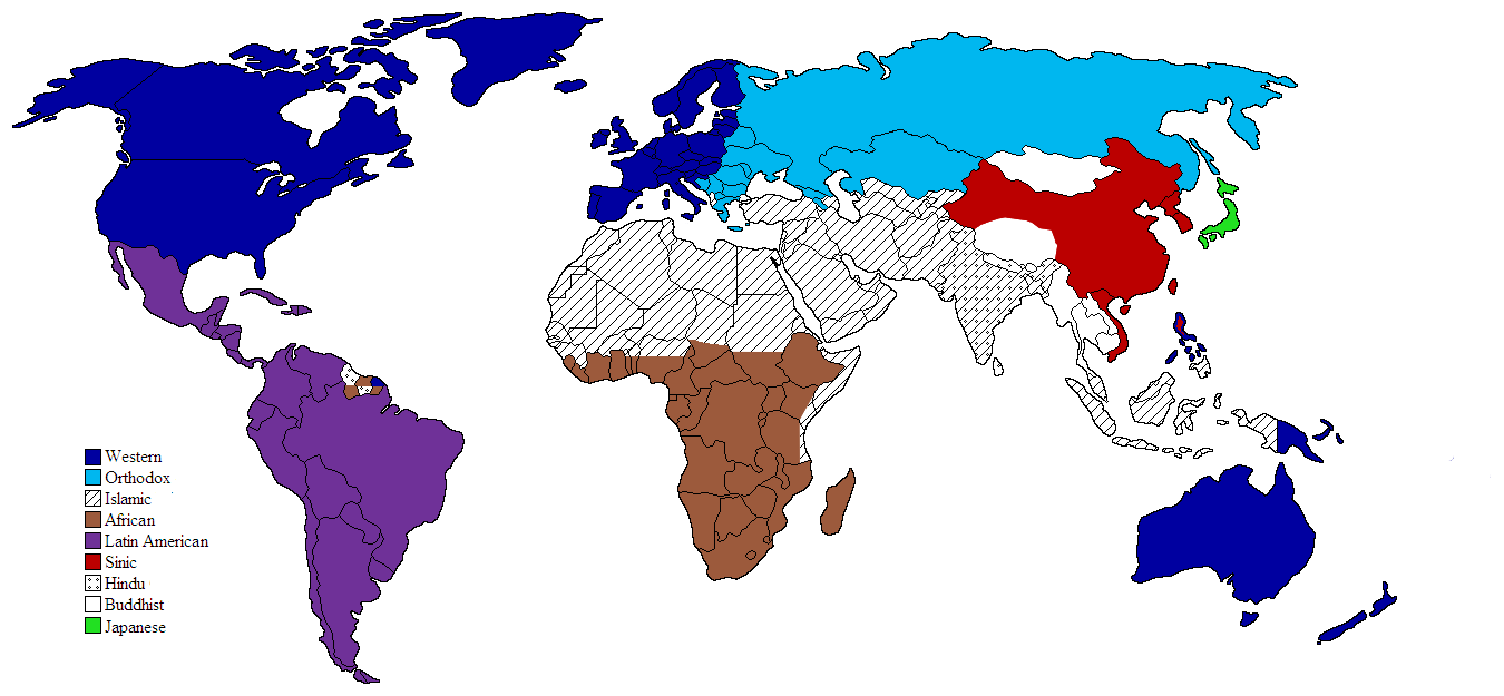 The map showing the "World of Civilizations" in Huntingdon's book presents nine civilizations, namely WESTERN, LATIN AMERICAN, AFRICAN, ISLAMIC, SINIC (Chinese), HINDU (Indian), ORTHODOX (largely Russian), BUDDHIST, and JAPANESE.