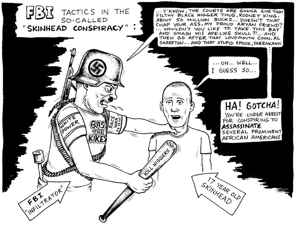 That one’s from Tom Metzger and “A. Wyatt Mann,” both talented writers from back in the day. Government agents and informants specialized in hitLARPing so hard that they often ended up running the organizations they were infiltrating, and their modus operandi was to encourage others to engage in illegal activity so that they could be arrested, brought down to the station and told their options. These options consisted of (1) go to jail forever, or (2) take $500 a month to inform on others and encourage them to hitLARP harder. It is no surprise that many of us estimate that half of the public white nationalism 1.0 was either informants or agents.