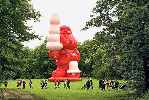 | This artist, in addition to this massive inflatable sculpture of a wholesome butt-plug-holding Santa makes chocolate edible versions of the sculpture. He’s Belgian. |
