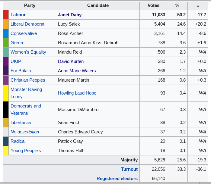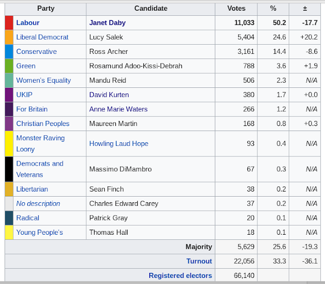 So, how did our brave civic nationalist heroes do is a country where the dominant political issue remains the push for BREXIT? The short answer is not very well. With around a third of the voters turning out, Labour easily won, although with a much reduced majority (+21,123 to +5,629). The real stories of the election were: