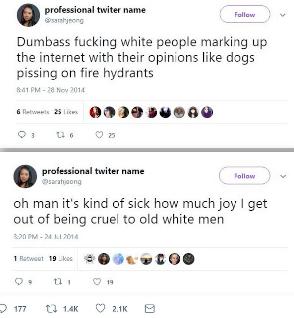 In case somebody reads this article several weeks, months, or years from now, when the story is dead and forgotten—as it surely will be—Sarah Jeong is the latest addition to the editorial board of that "Enemy of the People" the New York Times, and is currently in the news because of the new phenomenon of "Twitter mining" that we have seen since the case of James Gunn whose "paedo posts from the past" have come back to haunt him. In the case of Miss Jeong, the Twitter miners have managed to unearth a motherlode of racist anti-White tweets.