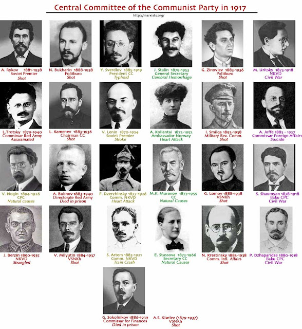 It shows the membership of the Central Committee of the Communist Party in 1917. The Central Committee was the ruling body of the Communist Party, but it only met for short periods, when it would pass resolutions and choose the membership of various committees and bureaus, like the Politburo. The picture above, which comes from Marxism.org, shows 26 members (and, funnily enough, also records the causes of their deaths).
